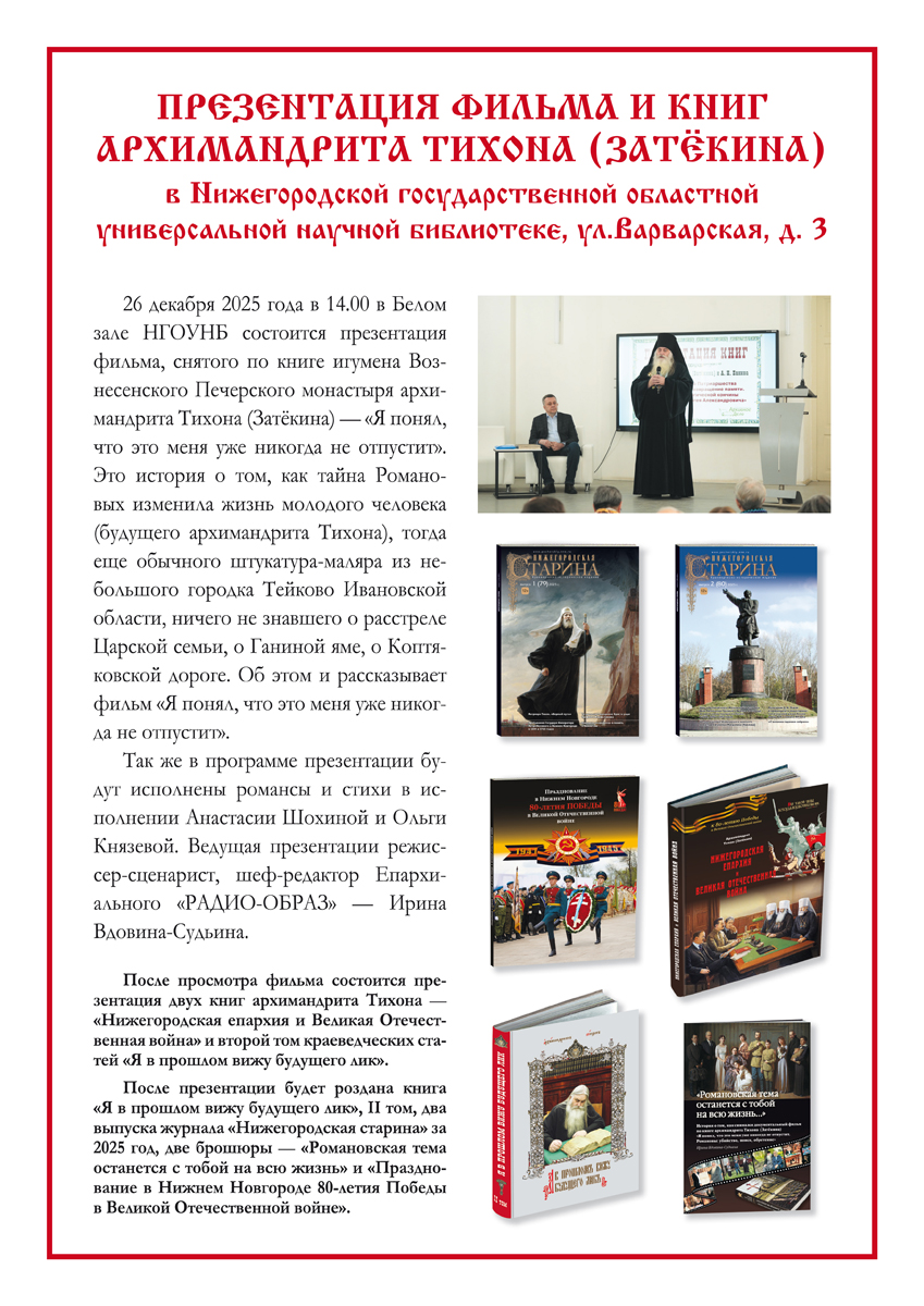Презентация состоится 26 декабря 2025 года в 14.00 в Белом зале Нижегородской государственной областной универсальной научной библиотеке (ул. Варварская, д. 3)